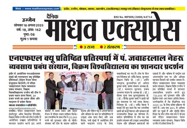 Congratulating The Team JNIBM, Prof Bhardwaj complimented academic excellence, Frequent Regular Jnibm Alumni Visits,and dedicated professional efforts of Both MBA students and Mentor Prof Dr.Mehta. VU EC Members FMS Dean Prof Kamran Sultan and Prof Dr Deepak Gupta Chairman BOS said that Vikram University is Proud of this Exceptional Achievement as Central India’s Leading Institute FMS-JNIBM